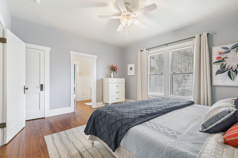 Inside, the vibe only gets better. Original wood floors, a cozy gas fireplace, antique hardware, and natural light pouring in from every angle—it all just works. The formal dining room, framed by classic French doors, feels equal parts timeless and intimate—perfect for dinner parties that turn into late nights.